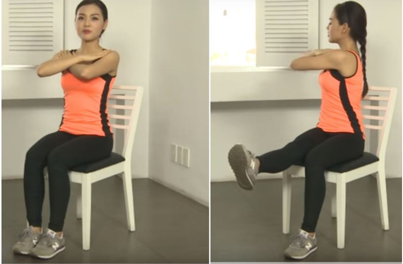 Bước 1: Ngồi thẳng lưng trên một chiếc ghế chắc chắn. Hai tay bắt chéo trước ngực, bàn tay chạm vào hai vai.