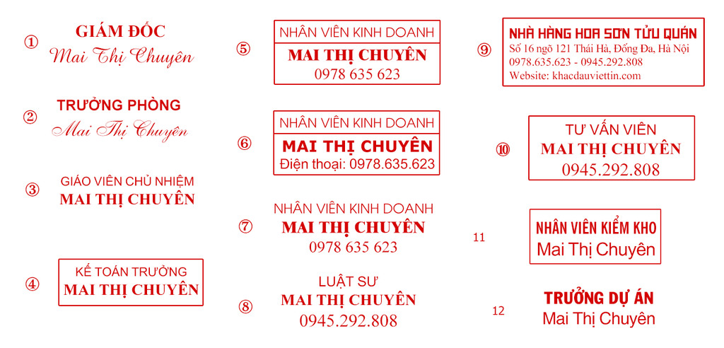 * Dấu được khắc bởi Shiny - một thương hiệu nổi tiếng trên thị trường, đảm bảo độ bền đẹp , rõ nét cho con dấu. * Các loại dấu: Dấu chữ ký, dấu chức danh, dấu logo, dấu hạn sử dụng, dấu ngày tháng năm, dấu vuông, dấu hoàn công…. * Tư vấn và giải đáp các thắc mắc về dịch vụ khắc dấu theo yêu cầu. * Giao dịch chuyên nghiệp, giao hàng tận nơi * Khách hàng đặt hàng với số lượng lớn được giá ưu đãi * Các màu mực thông dụng: Xanh biển/ Đỏ/ Đen * Các màu mực đặc biệt: Tím/ Xanh lá/ Hồng/ Cam…. Liên hệ trực tiếp:………………………… |